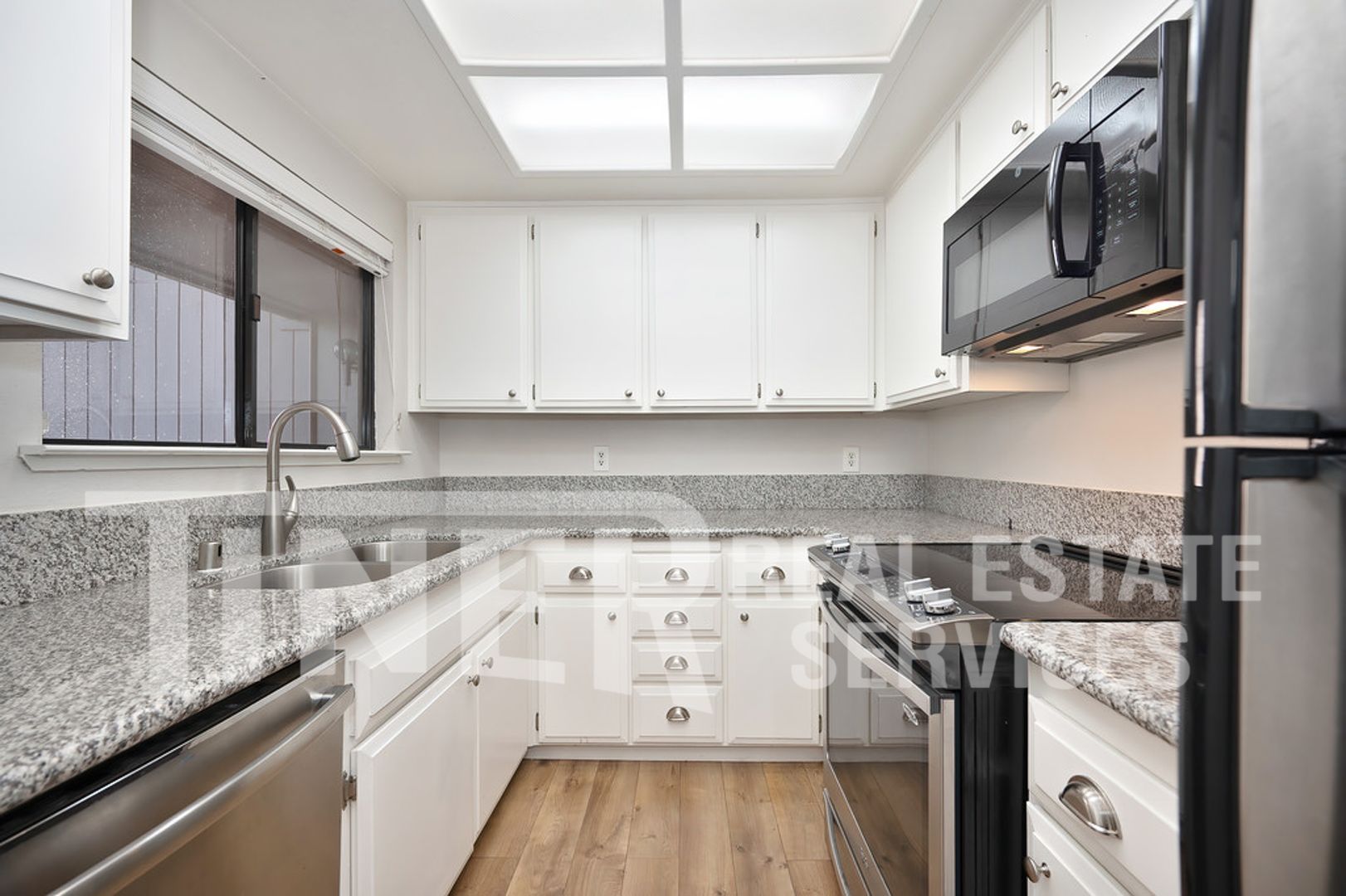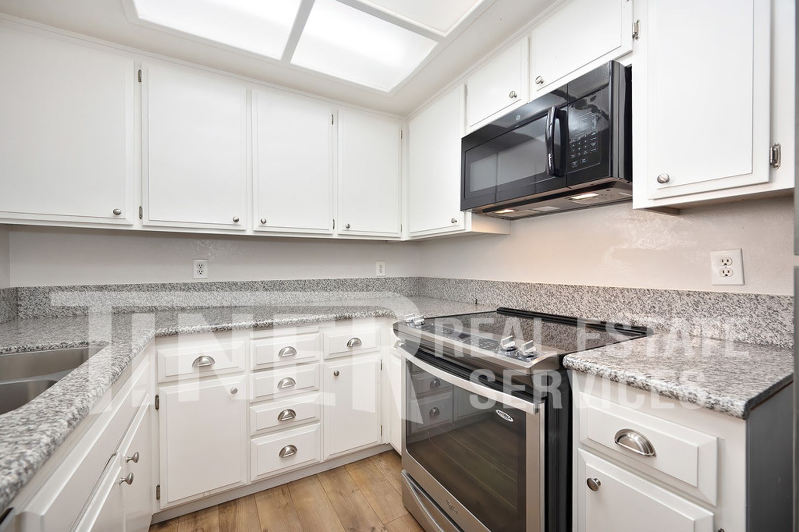 This downstairs unit is nestled in a gated community, offering peace of mind and a sense of security. The home boasts a host of modern amenities including a built-in microwave, central heat and air conditioning, and in-unit laundry facilities. The kitchen is a chef's dream with white cabinets, granite countertops, and laminate flooring. The spacious bedroom features a walk-in closet and French doors that open onto a private patio, perfect for enjoying your morning coffee.