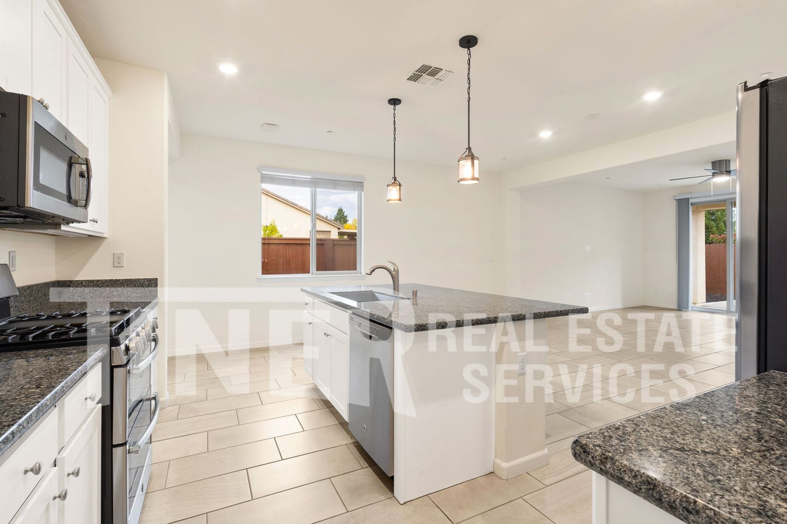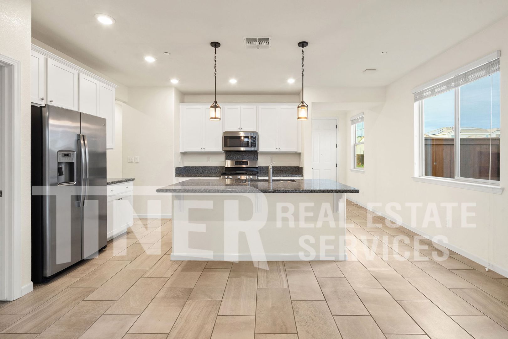 This corner lot property boasts modern finishes, including granite slab countertops, stainless steel appliances, and tile flooring. The kitchen is a chef's dream with a convenient island featuring a sink.