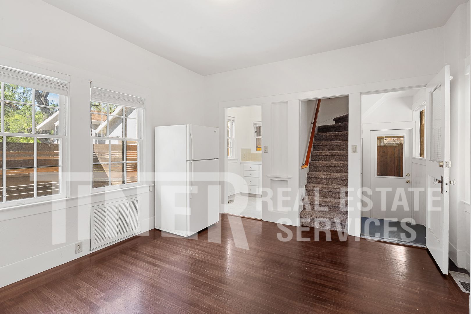 This one-bedroom, one-bath home in Sacramento features an open floor plan with abundant natural light from large windows fitted with blinds. The main living areas offer hardwood flooring, while the bedroom is carpeted for added comfort. Central heating and air conditioning provide year-round climate control, and in-unit laundry adds everyday convenience. A basement provides additional storage or flexible use space.