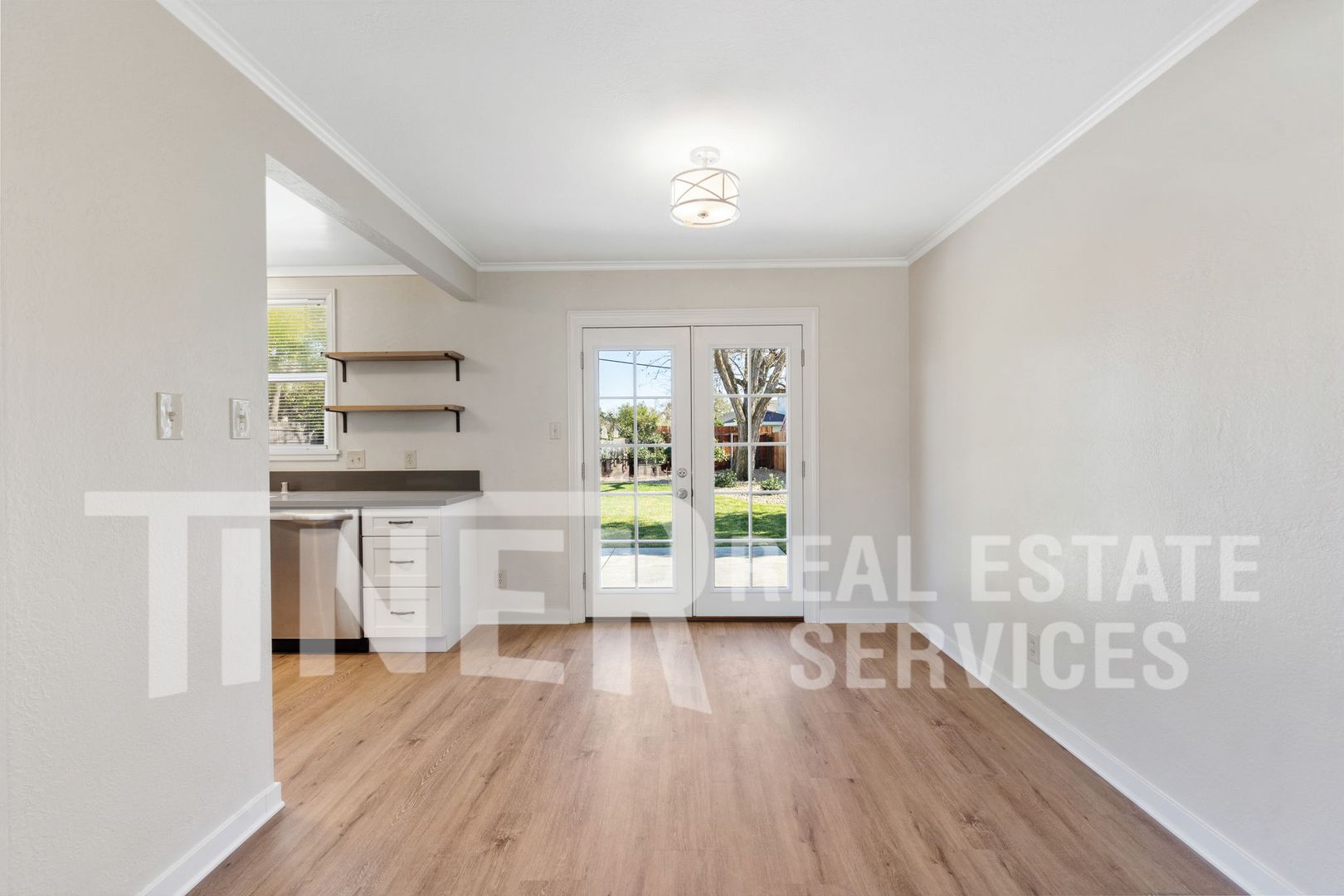 This modernly updated residence features plank flooring, quartz countertops, white kitchen cabinets, a farmhouse sink, and dual pane windows. French doors open to the backyard and a covered front porch provides additional outdoor space; there’s also a patio and nicely landscaped grounds.