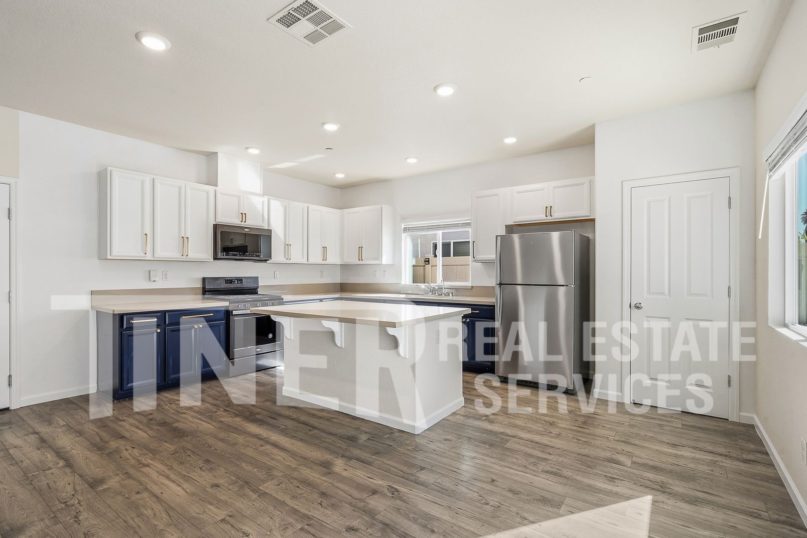 The modern kitchen features stainless steel appliances, quartz countertops, ample counter space, and painted cabinetry with distinctive gold hardware that adds a stylish touch. The open layout connects seamlessly to the living area. A water filtration system and water softener are also included. Recessed lighting and plentiful windows throughout the home contribute to a bright, airy atmosphere.