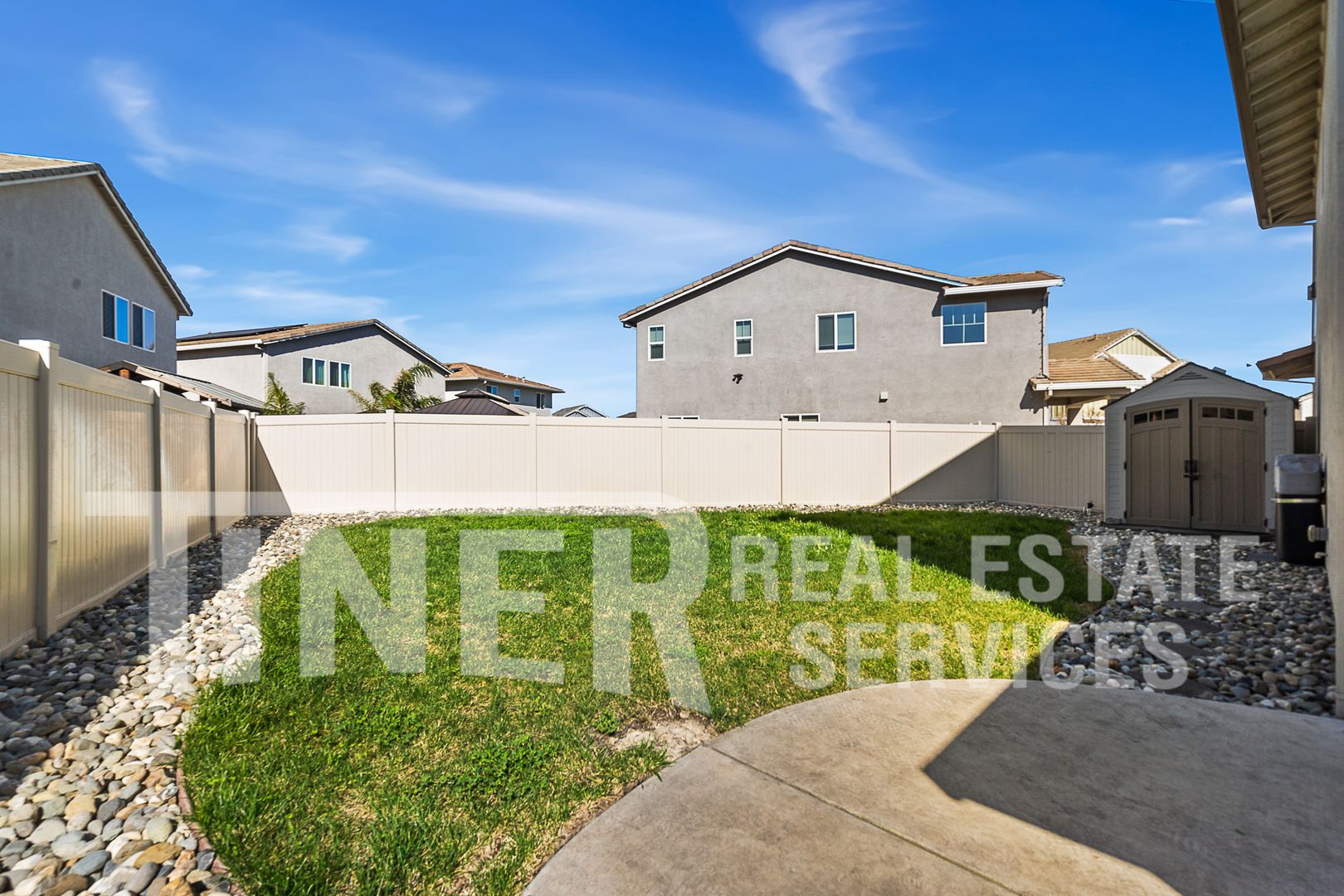 The backyard offers beautifully landscaped green space and a covered patio designed for year-round enjoyment. A solid patio cover provides shade and weather protection, while two ceiling fans help keep the space comfortable during warmer months. An outdoor shed provides additional storage.