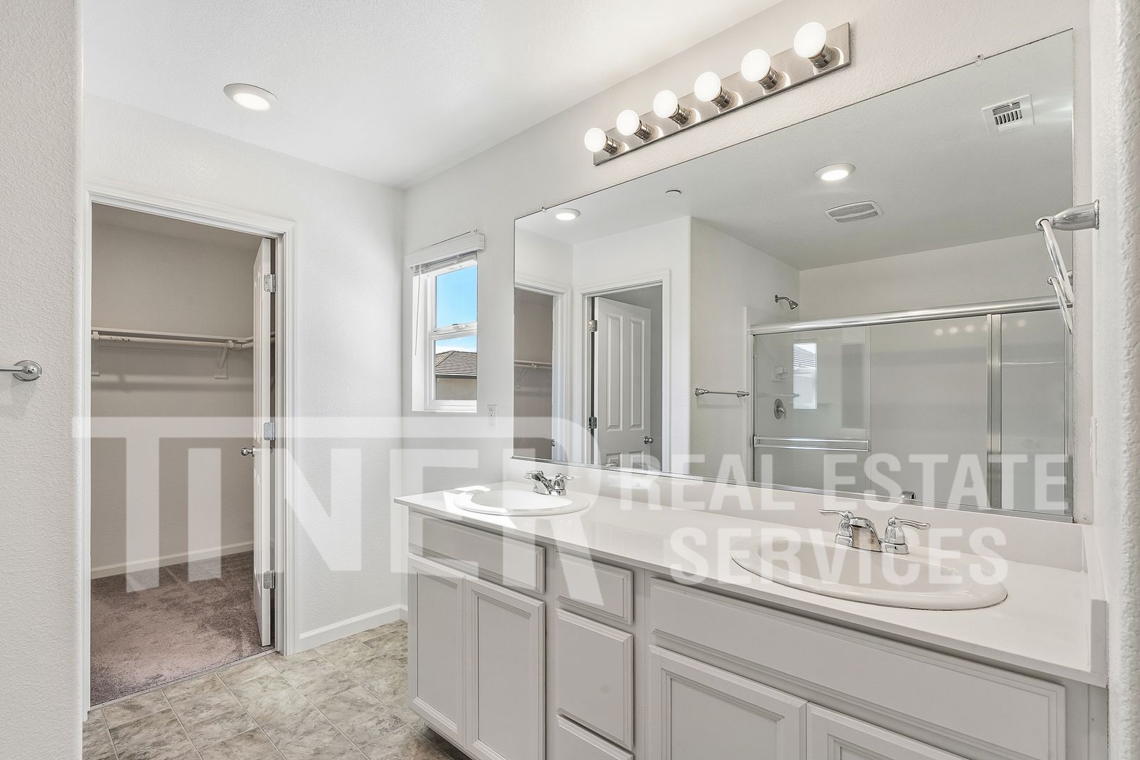 Upstairs, the bedrooms are arranged around a spacious landing area. The large primary suite includes a walk-in closet and an expansive primary bathroom with dual sinks and large walk-in shower.
